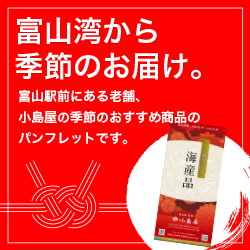 富山湾は美しいだけでなく、豊富な水産資源などの魅力が認められて、2014年に「世界で最も美しい湾クラブ」(ユネスコ後援)に加盟しました。その景観のすばらしさ、海の幸の豊かさは世界の折り紙付きです。そんな希少な富山湾の味を、70年の歴史をもつ海産物の老舗、「小島屋」が厳選してみなさんにお届けします。